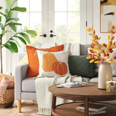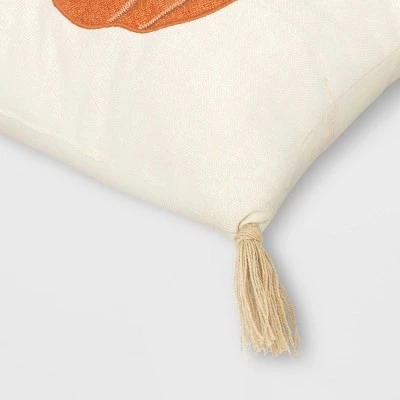 Add charming style and plenty of comfort to your space with this Applique Pumpkin Square Throw Pillow from Threshold™. Made from 100% cotton that feels soft against your skin, this decorative square pillow is filled with ample padding to provide you with plenty of support as you sit, recline or take a nap. Adorned with embroidered applique pumpkins on the front, this throw pillow features tassels at each corner that bring fun, festive flair to your home decor.