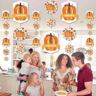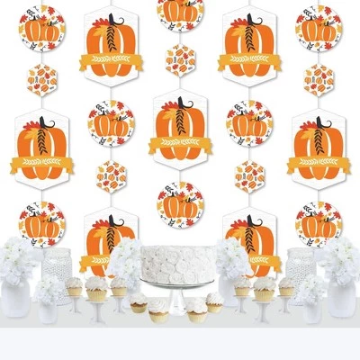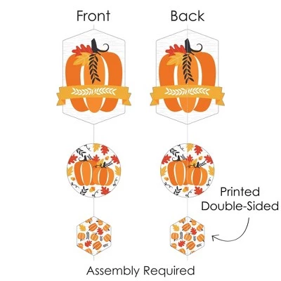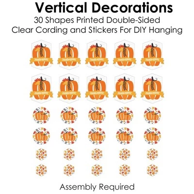 Fall Pumpkin Hanging Vertical Decorations INCLUDE 30 shaped pieces, 1 roll clear cording, and assembly stickers. Pumpkin Vertical Decorations are fun and versatile party danglers for your next Halloween or Thanksgiving Party. ROOMERIFIC: Fall Pumpkin Hanging Vertical Decorations can be displayed at any lengths you choose and make an attractive backdrop for your next Halloween or Thanksgiving Party. Shaped pieces come in 3 sizes of 10 each, with the following specifications: 10 at 8.5 x 11 inches, 10 at 6.25 x 6.25 inches, and 10 at 4 x 4.5 inches. Hang near a wall to capture fun group photos, or place throughout the room to create a unified theme. These also look amazing when coordinated above gift and buffet tables. DIY DONE RIGHT: Get ready for guests in a snap with this colorful, easy-to-assemble, 30-piece Fall Pumpkin Hanging Party Decorations kit. Printed double-sided, each shaped piece includes top and bottom tabs for easy hanging. Simply interlock clear cording into each piece and secure with provided clear stickers. HIGH-QUALITY DECOR: Pumpkin Hanging Vertical Decorations are professionally printed on heavy-duty cardstock paper. Each piece is individually inspected and carefully packaged by hand. Requires some simple do-it-yourself assembly. Use provided clear cording to display decorations however you prefer. MADE IN THE USA: Fall Pumpkin Hanging Vertical Decorations are designed and manufactured at our Wisconsin facility using materials that are Made in the USA.