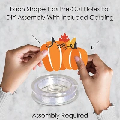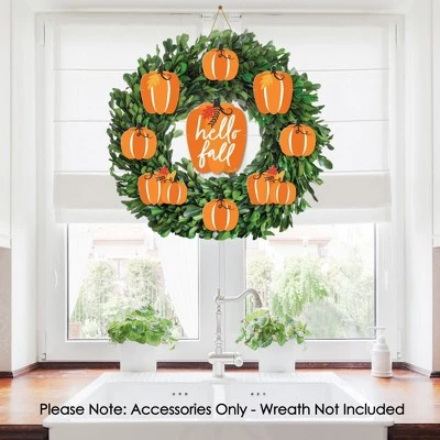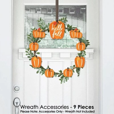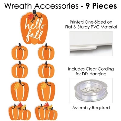 Fall Pumpkin Wreath Accessories set INCLUDES: 9 sturdy, flat, and professionally printed single-sided pumpkin accessories for your decorative wreath. Comes with clear cording for easy DIY hanging. DECOR-PERFECT: Dress up your favorite wreath with Fall Pumpkin Wreath Accessories. Cut the included clear cording to desired lengths and thread cording pieces through pre-cut holes on each accessory, from back to front. Tie accessories to the wreath where desired and hang the wreath on your front door or inside wall. FUN ACCESSORIES: Embellish your favorite Fall, Halloween or Thanksgiving Party decor with Fall Pumpkin Wreath Accessories. Versatile and easy-to-assemble, this flat accessory set can be used for all kinds of decorating. Tie pieces to a favorite wreath or even add to centerpieces and displays at your next party. Sturdy enough to be reused again and again. PREMIUM HOLIDAY DECOR: Fall Pumpkin Wreath Accessories are made of flat and sturdy PVC material. These front door decorations are professionally printed on 1 side, back will be white. This set of 9 pumpkin accessories includes clear cording for DIY assembly and hanging. CARE TIP: For best results, display your Wreath Accessories in temperatures no higher than 130 degrees Fahrenheit and hang wreath on outermost door, as placing between two doors risks exposure to excessive heat. MADE IN THE USA: Fall Pumpkin Wreath Accessories are designed and manufactured at our Wisconsin facility using materials that are Made in the USA.