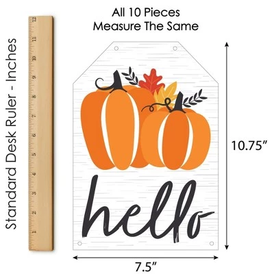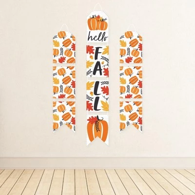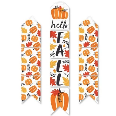 Fall Pumpkin Indoor Door Decor INCLUDES: 10 heavy-duty paper pieces to create 3 vertical banners and 10 yards white 2mm satin cord. Easy assembly required. FUN PARTY BANNER: Vertical hanging door banners will create that wow-factor at your Halloween or Thanksgiving Party. Hang at the entrance of your event, over the food or gift table, or any open wall space to create a fun focal point. WALL DECORATION KIT: All banner sign pieces SIZE 7.5 inches wide x 10.75 inches. Each piece has pre-cut holes for easy DIY hanging with the included 10 yards of white 2mm satin cord. This DIY banner decor kit allows you to choose the spacing between each piece and string the cording through at your desired length. Clear adhesive stickers are also included to secure cording onto the back of each banner piece. PREMIUM PARTY SUPPLIES: Fall Pumpkin hanging vertical door banner decoration pieces are professionally printed one-sided on heavy-duty cardstock paper. Each banner piece is individually inspected and carefully packaged by hand. Pumpkin wall decoration kit requires some easy assembly. Follow the number sequence on the back of each banner piece and simply string the included cording through the pre-cut holes. MADE IN THE USA: Fall Pumpkin paper door banner decoration kit is designed and manufactured at our Wisconsin facility using materials that are Made in the USA.