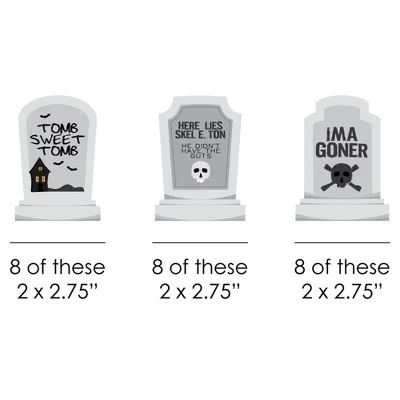 - Cut Out Designs Read: “Tomb Sweet Tomb”, “Here Lies Skel E. Ton He Didn’t Have The Guts” and “I’m A Goner”