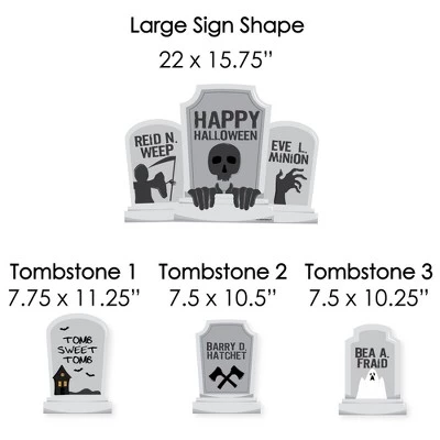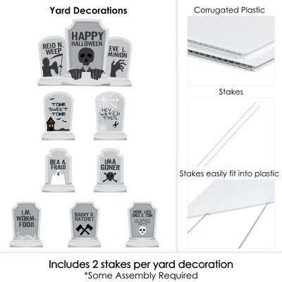 Tombstone Lawn Decorations INCLUDES 8 coordinating Graveyard Tombstones yard decorations: 1 Tombstones, 2 Tombstone 1, 2 Tombstone 2, 3 Tombstone; and 16 stakes for displaying. Easy assembly instructions are also included. PERFECT FOR ANY LOCATION! Graveyard Tombstones Yard Signs SIZE Large Tombstones 22″ x 15.75″; Tombstone 1 – 7.75″ x 11.25″; Tombstone 2 – 7.5″ x 10.5″; Tombstone 3 – 7.5″ x 10.25. Headstone yard decor is an easy way to decorate your home or business for Halloween party. Both adults and kids will love these Halloween party supplies. EASY TO USE: Tombstones – Yard Sign & Outdoor Lawn Decorations are professionally printed and cut, making assembly quick and easy. Simply insert two heavy-duty stakes into each tombstone yard ornament and press into the ground to display. HIGH-QUALITY YARD DECORATIONS: Graveyard Tombstones Yard Signs are professionally printed on durable, corrugated plastic. 8-Piece yard decorations are waterproof and can be used outdoors. Graveyard Tombstones lawn decor can be displayed in wind, snow and rain without any worry. MADE IN THE USA: Graveyard Tombstones – Yard Sign & Outdoor Lawn Decorations are designed and manufactured at our Wisconsin facility using materials that are Made in the USA.