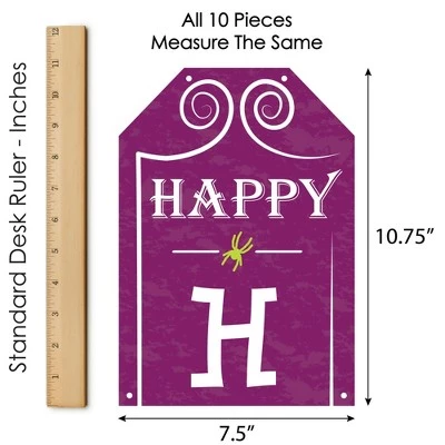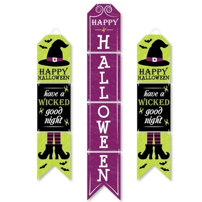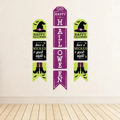 Happy Halloween Indoor Door Decor INCLUDES: 10 heavy-duty paper pieces to create 3 vertical banners and 10 yards white 2mm satin cord. Easy assembly required. FUN PARTY BANNER: Vertical hanging door banners will create that wow-factor at your Witch Party. Hang at the entrance of your event, over the food or gift table, or any open wall space to create a fun focal point. WALL DECORATION KIT: All banner sign pieces SIZE 7.5 inches wide x 10.75 inches. Each piece has pre-cut holes for easy DIY hanging with the included 10 yards of white 2mm satin cord. This DIY banner decor kit allows you to choose the spacing between each piece and string the cording through at your desired length. Clear adhesive stickers are also included to secure cording onto the back of each banner piece. PREMIUM PARTY SUPPLIES: Happy Halloween hanging vertical door banner decoration pieces are professionally printed one-sided on heavy-duty cardstock paper. Each banner piece is individually inspected and carefully packaged by hand. Halloween Witch wall decoration kit requires some easy assembly. Follow the number sequence on the back of each banner piece and simply string the included cording through the pre-cut holes. MADE IN THE USA: Happy Halloween paper door banner decoration kit is designed and manufactured at our Wisconsin facility using materials that are Made in the USA.
