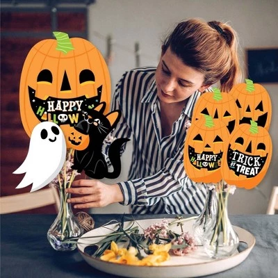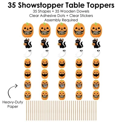 Jack-O’-Lantern Halloween Showstopper Table Toppers INCLUDE: 35 heavy-duty paper centerpiece cut-outs in our Jack-O’-Lantern Halloween theme. Each cut-out shape is printed double-sided and includes 35 wooden dowel sticks. DIY assembly is required. EASY TABLE DECORATIONS: Jack-O’-Lantern Halloween showstopper party centerpieces come with a variety of fun shapes and in the perfect sizes to create impressive tabletop decorations. Place assembled centerpiece sticks into jars or floral arrangements for that showstopper wow-factor. DIY PARTY CENTERPIECES: Jack-O’-Lantern Halloween centerpiece kit arrives with wooden dowels and reinforcing stickers for easy DIY assembly. Simply press the included reinforcing sticker onto one dowel stick, near the end of dowel. Then, firmly press dowel to the back of a table topper shape. HIGH-QUALITY PARTY SUPPLIES: Jack-O’-Lantern Halloween showstopper table toppers are professionally printed double-sided on sturdy cardstock paper with a photo-like shine. They are individually inspected and carefully packaged by hand. Showstopper table toppers will arrive unassembled, leaving your DIY Halloween party idea options endless. MADE IN THE USA: Jack-O’-Lantern Halloween showstopper table toppers are designed and manufactured at our Wisconsin facility using materials that are Made in the USA.