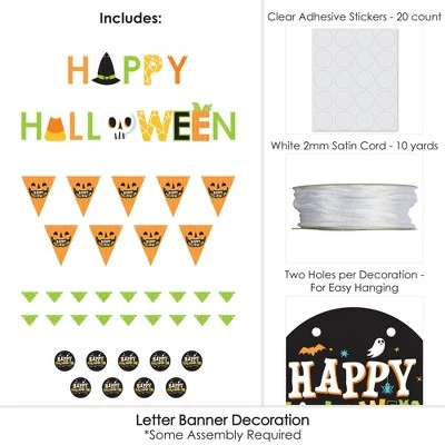 Jack-O’-Lantern Halloween Letter Banner Decoration INCLUDES Happy Halloween letters, 36 banner pennant pieces, and cord for hanging. Jack-O’-Lantern Halloween banner will look great at any venue! VARIETY OF DESIGNS & SIZES! Jack-O’-Lantern Halloween Letter Banner features coordinating pennant pieces and letters. Decorate your event with 9 large triangle pennants (6.25” x 7.5”); 9 circle pennants (3.75” x 3.75”); 18 small triangle pennants (3.25” x 2”); and Happy Halloween letters. Easily string them together with the included 10 yards of satin cording. SPOOKY KIDS PARTY DECORATIONS: A Jack-O’-Lantern Halloween Bunting Banner is an easy way to decorate for your party and bring your Green and Orange theme to life. Hang at the entrance of your Spooky Kids Halloween Party, over the food table or candy buffet, and even by the gift table. PREMIUM KIDS HALLOWEEN PARTY SUPPLIES: Jack-O’-Lantern Halloween Letter Banner is professionally printed on sturdy cardstock paper. Each pennant is individually inspected then carefully packaged by hand. Happy Halloween letter banners require some easy assembly. Simply string the cord through the holes on each letter piece and add triangle and circle pennants to complete the banner. Create multiple rows by cutting the cord to your desired length or hang as one long banner. MADE IN THE USA: Jack-O’-Lantern Halloween Spooky Kids Halloween Party Banner Decoration is designed and manufactured at our Wisconsin facility.