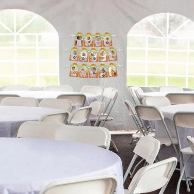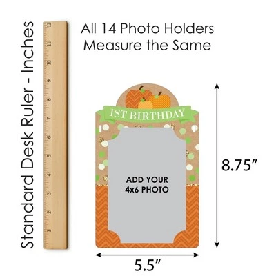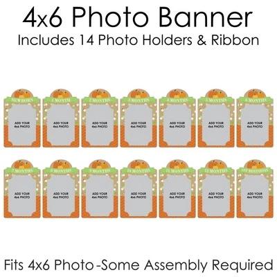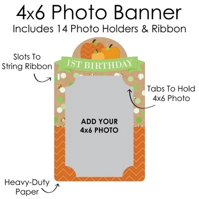 Pumpkin Patch Photo Banner INCLUDES 14 sturdy and professionally printed photo holders and ribbon for DIY hanging. Each photo holder has pre-cut tabs to display your 4×6 photos vertically. Some assembly required. DIY PICTURE BANNER: Put the guest of honor in the spotlight when you feature a 1-12 Monthly Picture Display. Each photo holder has two slots to string the included ribbon through and 4 pre-cut slits to tab your 4×6 photos vertically in place. Bonus: Pumpkin Patch Photo Banner is a damage free way to display your favorite picture display. FUN PARTY DECOR: Fall, Halloween, or Thanksgiving Birthday Party DIY Photo Banner is an easy way to decorate for your party and bring your Pumpkin Patch theme to life. Hang at the entrance of your event, over the food table or candy buffet, at the gift table, or behind the head table. PREMIUM PARTY DECORATION: Pumpkin Patch Fall, Halloween, or Thanksgiving Birthday Photo Banner is professionally printed on sturdy cardstock paper. Each photo holder is individually inspected then carefully packaged by hand. 1-12 Monthly Picture Display Banner requires do-it-yourself assembly. Following the number sequence on the back of each photo holder, simply string the included satin ribbon through the slots. Create multiple rows or hang as one long banner. MADE IN THE USA: Pumpkin Patch Photo Banner is designed and manufactured at our Wisconsin facility using materials that are Made in the USA. Pumpkin Patch DIY Photo Banner uses a No-Mess Glitter Print: Our Photo Banner holders are designed with a printed image of glitter, eliminating glitter flake while maximizing bling effect!