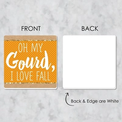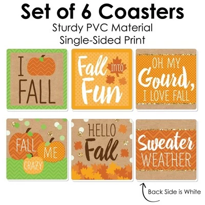 Pumpkin Patch Coasters INCLUDE 6 sturdy and professionally printed single-sided Drink Coasters. Protect your table or desk with funny fall, Halloween, or Thanksgiving coasters. DRINK COASTER SET: This set of 6 Coasters has a different funny fall, Halloween or Thanksgiving saying for each coaster including I Love Fall, Fall into Fun, Oh My Gourd, I Love Fall, Fall Me Crazy, Hello Fall, and Sweater Weather Use the Coasters for hot/cold drinks to protect furniture and tabletops from drips, spills, and condensation. FUN PARTY FAVOR: Drink Coasters make for a perfect gift idea! With multiple designs, guests can use a Pumpkin Patch Coaster as a drink marker and then take home as a fun party favor. Or gift the full set as a unique housewarming present. PREMIUM DECORATIONS: Pumpkin Patch Coasters are made of sturdy PVC material and SIZE 4 inches width x 4 inches length x 1/8 inch thick. Professionally printed on one side, back and edge of coasters will be white. MADE IN THE USA: Pumpkin Patch Coasters are designed and manufactured at our Wisconsin facility using materials that are Made in the USA. Pumpkin Patch Drink Coasters use a No-Mess Glitter Print: Our coasters are designed with a printed image of glitter, eliminating glitter flake while maximizing bling effect!