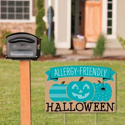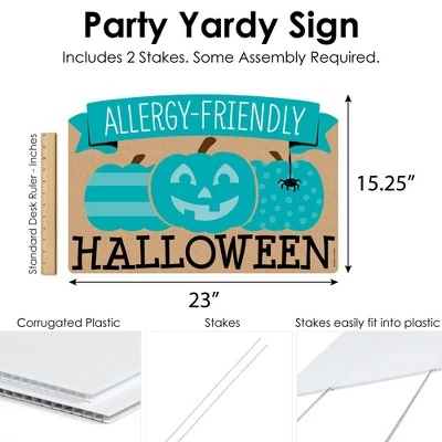 Teal Pumpkin Party Yardy Sign INCLUDES 1 weather resistant plastic sign and 2 sturdy stakes for displaying. Create goose bump moments, those memories to last a lifetime, when you display Allergy-Friendly Halloween yard sign with stakes. OUTDOOR LAWN DECOR: This Halloween yard sign lawn decoration MEASURES 23 inches wide x 15.25 inches tall. The perfect size to stake into the ground, creating an eye-catching display at your home, business, or party venue. If displayed outdoors, yard sign rules and regulations vary from city and state, we recommend checking your local guidelines. EASY TO USE YARD SIGN: Teal Pumpkin outdoor yard sign is professionally printed and cut, making assembly quick and easy. Simply insert two heavy-duty stakes into Teal Pumpkin yard ornament and press firmly into the ground to display. Easy assembly instructions are included. HIGH-QUALITY YARD DECORATION: Teal Pumpkin yard sign decoration is professionally printed on durable, corrugated plastic. Halloween Party Yard Sign Lawn Decoration is waterproof and can be used outdoors – displayed in wind, snow, and rain without any worry. MADE IN THE USA: Teal Pumpkin yard sign is designed and manufactured at our Wisconsin facility using materials that are Made in the USA. If displayed outdoors, yard sign rules and regulations vary from city and state, we recommend checking your local guidelines.