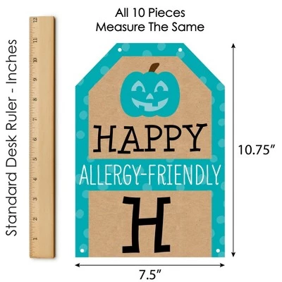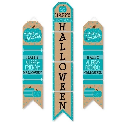 Teal Pumpkin Indoor Door Decor INCLUDES: 10 heavy-duty paper pieces to create 3 vertical banners and 10 yards white 2mm satin cord. Easy assembly required. FUN PARTY BANNER: Vertical hanging door banners will create that wow-factor at your Allergy Free Halloween Party. Hang at the entrance of your event, over the food or gift table, or any open wall space to create a fun focal point. WALL DECORATION KIT: All banner sign pieces SIZE 7.5 inches wide x 10.75 inches. Each piece has pre-cut holes for easy DIY hanging with the included 10 yards of white 2mm satin cord. This DIY banner decor kit allows you to choose the spacing between each piece and string the cording through at your desired length. Clear adhesive stickers are also included to secure cording onto the back of each banner piece. PREMIUM PARTY SUPPLIES: Teal Pumpkin hanging vertical door banner decoration pieces are professionally printed one-sided on heavy-duty cardstock paper. Each banner piece is individually inspected and carefully packaged by hand. Allergy Friendly Trick or Trinket wall decoration kit requires some easy assembly. Follow the number sequence on the back of each banner piece and simply string the included cording through the pre-cut holes. MADE IN THE USA: Teal Pumpkin paper door banner decoration kit is designed and manufactured at our Wisconsin facility using materials that are Made in the USA.
