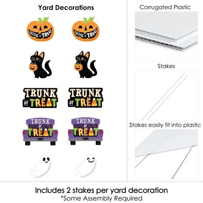 Outdoor Halloween Car Parade Lawn Decorations INCLUDE: 10 coordinating Trunk or Treat yard decorations: 2 – “Trunk or Treat” Car Shapes, 2 – Black Cat Shapes, 2 – “Trunk or Treat” Shapes, 2 – Ghost Shapes, 2 – “Trunk or Treat” Jack-O’-Lantern Shapes and 20 sturdy stakes for displaying. PERFECT FOR ANY LOCATION! Trunk or Treat Yard Signs SIZE: “Trunk or Treat” Car Shapes – 13.75 inches x 10.75 inches, Black Cat Shapes – 9 inches x 10.5 inches, 2 – “Trunk or Treat” Shapes – 13.75 inches x 7.75 inches, Ghost Shapes – 8 inches x 9 inches, and “Trunk or Treat” Jack-O’-Lantern Shapes – 10.5 inches x 9.5 inches. Vibrant Trunk or Treat yard decor is an easy way to decorate a Halloween Party. Both adults and kids will love these Halloween Car Parade party supplies. Display in front yards of your home or party venue. EASY TO USE: Trunk or Treat Lawn Decorations are professionally printed and cut, making assembly quick and easy. Simply insert two heavy-duty stakes into each yard ornament and press into the ground to display. HIGH-QUALITY YARD DECORATIONS: Trunk or Treat – Lawn Yard Signs are professionally printed on durable, corrugated plastic. 10-Piece yard decorations are waterproof and can be used outdoors. Halloween Car Parade lawn decor can be displayed in wind, snow, and rain without any worry. MADE IN THE USA: Trunk or Treat – Lawn Decorations – Outdoor Halloween Party Yard Decorations are designed and manufactured at our Wisconsin facility using materials that are Made in America.