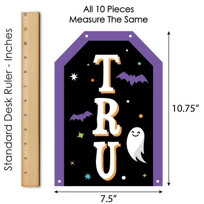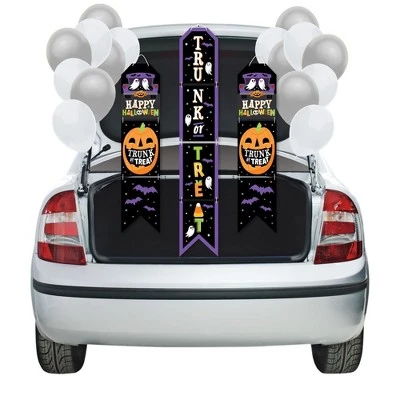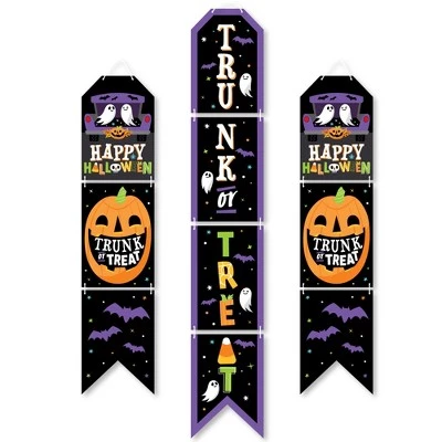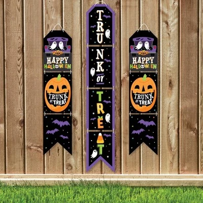 Trunk or Treat Indoor Door Decor INCLUDES: 10 heavy-duty paper pieces to create 3 vertical banners and 10 yards white 2mm satin cord. Easy assembly required. FUN PARTY BANNER: Vertical hanging door banners will create that wow-factor at your Halloween Car Parade Party. Hang at the entrance of your event, over the food or gift table, or any open wall space to create a fun focal point. WALL DECORATION KIT: All banner sign pieces SIZE 7.5 inches wide x 10.75 inches. Each piece has pre-cut holes for easy DIY hanging with the included 10 yards of white 2mm satin cord. This DIY banner decor kit allows you to choose the spacing between each piece and string the cording through at your desired length. Clear adhesive stickers are also included to secure cording onto the back of each banner piece. PREMIUM PARTY SUPPLIES: Trunk or Treat hanging vertical door banner decoration pieces are professionally printed one-sided on heavy-duty cardstock paper. Each banner piece is individually inspected and carefully packaged by hand. Community Trunk or Treat wall decoration kit requires some easy assembly. Follow the number sequence on the back of each banner piece and simply string the included cording through the pre-cut holes. MADE IN THE USA: Trunk or Treat paper door banner decoration kit is designed and manufactured at our Wisconsin facility using materials that are Made in the USA.