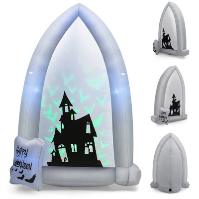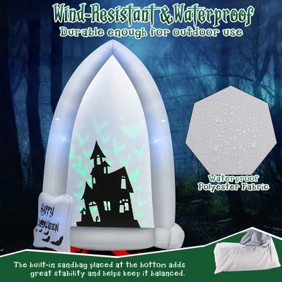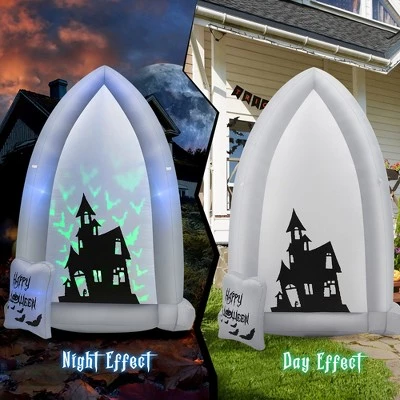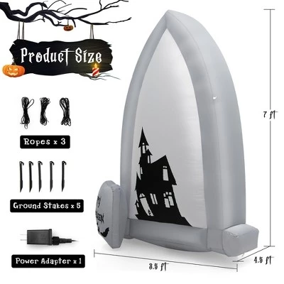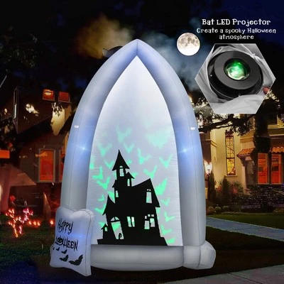 - Spooky Halloween Decoration: This 7 ft giant inflation tombstone painted with haunted castle, and a group of green bats fly out from the castle, perfectly setting off the scary Halloween atmosphere. Turn your house into a gloomy haunted castle with this unique Halloween decoration to let your kids and guests enjoy endless fun.