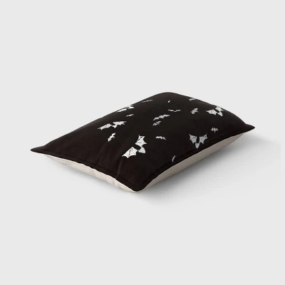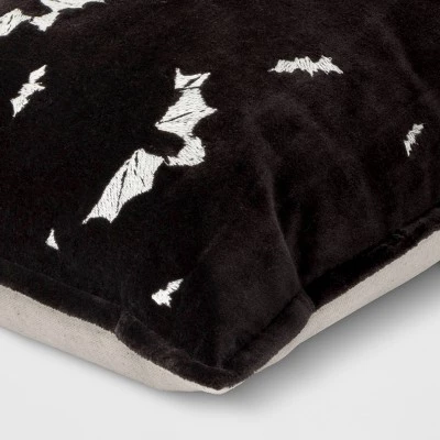 Add some Halloween spirit to your home with the Embroidered Bats Velvet Lumbar Throw Pillow from Threshold™. Made from a cotton-linen blend with soft filling, this lumbar velvet throw pillow showcases a white embroidered print of flying bats on a solid black background for a fun, frightful look. Style it solo on a chair or add it to a collection of pillows on a sofa or couch with other Halloween-themed hues and patterns.