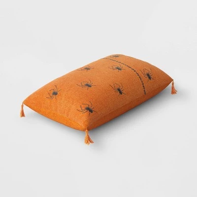 Bring a fun touch to your Halloween decor with this Embroidered Spider Lumbar Throw Pillow from Thresholdâ˘. This decorative throw pillow is soft to the touch and lends snuggly comfort with its cushioned construction. Plus, it features allover spider print along with tassels at each corner to put a perfect finishing touch on your Halloween decor. Designed with a sewn-seam closure and knife-edge detailing for a neat look, this throw pillow makes a perfect accent piece for your sofa, armchair or bed.