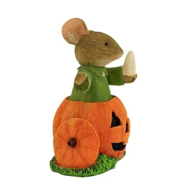 Diving For Pumpkin Seeds, This Clever Critter Carves A Jack-O-Lantern With An Inviting Grin. Holding A Large Seed In Hand, The Artist Has Finished His Masterpiece And Earned His Prize. With A Bedazzled Crystal On His Collar, This Mouse Shines.. New. Comes Packaged In A Box.. Measurements 2.25 In H X 1.5 In W X 1 In D. . Made Of Resin. No Assembly Required. Indoor Use Only. Imported. NOTE: Not A Toy, For Decorative Use Only.