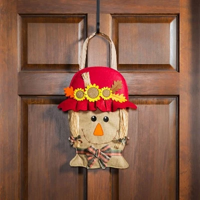 Greet guests this fall with this welcoming Mrs. Scarecrow Door Decor. The design of this scarecrow will get you in the autumn spirit with her rustic charm and fall colors. Mrs. Scarecrow’s outfit is complete with a red hat, bright yellow florals, and stylish fall ribbon. This cheerful scarecrow also wears a contagious smile that will delight every passerby.