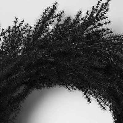 Highlight your spooky decor with this Fluffy Grass Wreath from Thresholdâ˘. This unlit wreath features faux pine-like leaves in black to accentuate your Halloween decor. Decorate it with small props and hang it on any wall, door or above the mantel to set the right ambiance for your favorite time of year.