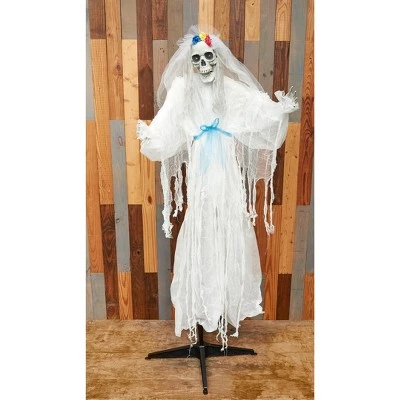 The life size Haunted Bride Sound and Motion Figure gives “till death do us part” a whole new meaning. When this skeleton bride begins to move and groan, you’ll have to try not to run for the hills! This is the perfect figure to put the “haunted” into your haunted house or your Halloween display. Crafted of iron, plastic and polyester, 3 AA batteries required. Overall figure dimensions: 65-inches long x 45-inches wide 6-inches deep, some assembly required. Care: Spot Clean. Batteries not included. Imported.