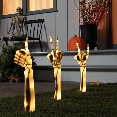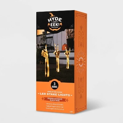 Round out your Halloween decor with this 3ct LED Lighted Skeleton Hands Halloween Novelty Path Lights from Hyde & EEK! Boutique™. This three-piece path lights set features white skeleton hand-shaped lights perched upon stakes that link together to guide trick-or-treaters and guests on Halloween night, while the spooky skeleton hand accents and warm white glow add extra flair to your Halloween theme. Pair the lights with other decorative Halloween props for stylish Halloween decor.