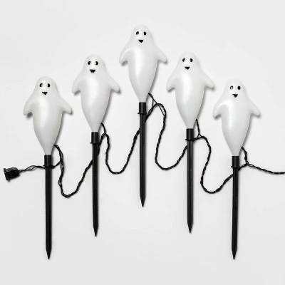 Decorate your walkway or other outdoor space with the 5-Count of Incandescent Clear Ghost Halloween Pathway Stake Lights from Hyde & EEK! Boutique™. These pathway lights are designed in the shape of a ghost and include a stake for securing in the ground. The pack includes five lights that connect end to end with other lights, and they’re powered by a 24-inch cord. These incandescent clear bulbs will light the way for trick-or-treaters while adding spooky, ghostly fun to your outdoor decor.
