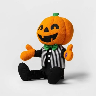 - Includes plush orange pumpkin character outfitted in pinstripe vest with buttons and a green bow tie