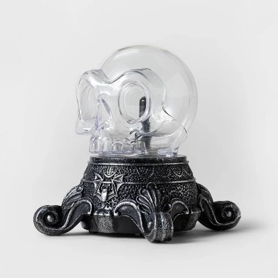 Bring frightfully fun ambiance to your seasonal scene with the Animated Plasma Skull Halloween Decorative Scene Prop from Hyde & EEK! Boutique™. A clear skull sits atop an ornate base and lights up and glows with the help of the included four AA batteries. Designed for indoor use, this plasma skull scene prop works as either a solo accent piece or part of a larger Halloween display.