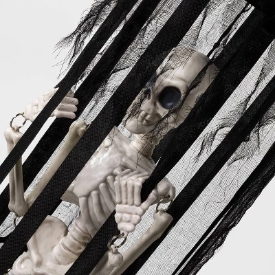 Create a creepy atmosphere to welcome party guests or trick-or-treaters this Halloween with the help of the Animated Skeleton in a Cage Halloween Decorative Scene Prop from Hyde & EEK! Boutiqueâ„¢. This hanging Halloween decoration features a skeleton grasping at the bars of a black cage, and it lights up and shakes when activated by sound. Suitable for indoor or sheltered outdoor use, it’s a perfect addition to your haunted home.