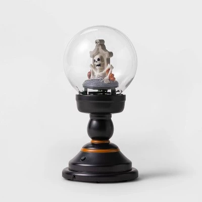 - Snowglobe sits on tall black platform for spooky display