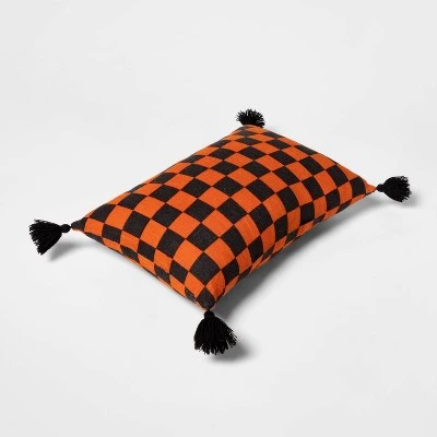 Add a classic seasonal accent to your home decor theme with the Check Lumbar Throw Pillow from Hyde & EEK! Boutique™. Featuring soft fabric for comfort, this check pattern lumbar throw pillow has a bold black-and-orange design for versatile style. Showcasing a sewn-seam closure and black tassels at each corner, it has a plush look and feel for cozy appeal. Toss it on a sofa or chair in your living room, and pair it with a coordinating Halloween throw blanket for a fun look.