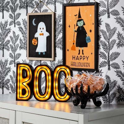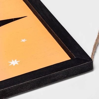 Welcome the spooky season with this Happy Halloween Sign from Hyde & EEK! Boutique™. Made from medium-density fiberboard, this hanging sign features a friendly witch holding a broom and a bag that reads “EEK” as well as the text “Happy Halloween” along the bottom. It’s designed with an orange background and a black frame for classic Halloween style, and the attached string makes it easy to hang from a pin, hook or nail.