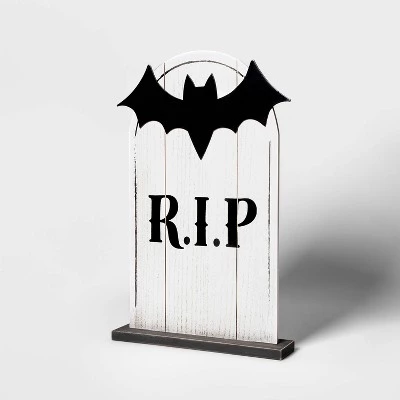 - Gray tombstone features a black bat and the initials “R.I.P.”