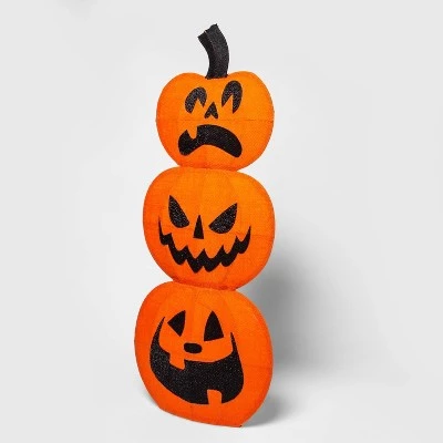 - Lighted stacked jack-o’-lantern sign completes the festive look of your space