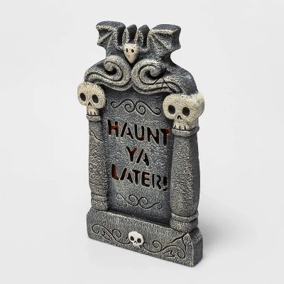 Create a haunted atmosphere in your backyard with this Haunt Ya Later Foam Tombstone Halloween Decorative Prop from Hyde & EEK! Boutique™. This decorative foam tombstone makes an exciting addition to your Halloween props. It features a realistic-looking sculpted design with a frightening “Haunt Ya Later” message printed on it. The battery-operated decoration lights up design for a fun, spooky effect. Place it next to your graveyard scene, haunted house or entryway to create a scary atmosphere for Halloween parties.