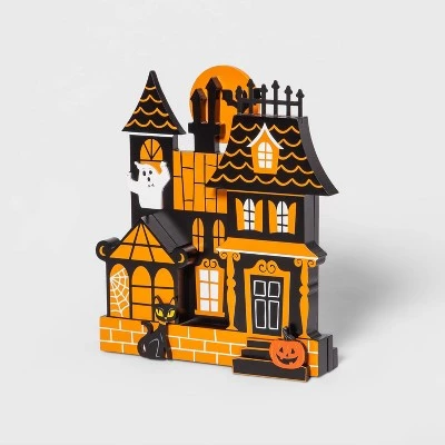 Create your own little creepy yet cute town with this Mini Mantel Wood Haunted House Halloween Decorative Prop from Hyde & EEK! Boutique™. This cute tabletop display features a brightly colored haunted house, complete with a bright autumn moon and friendly ghosts with cat and jack-o’-lantern accents and more in traditional Halloween hues. Perfect for a stand-alone display, you can also style it along with other mini Halloween-themed props to enhance your festive Halloween decor on a mantel or tabletop.