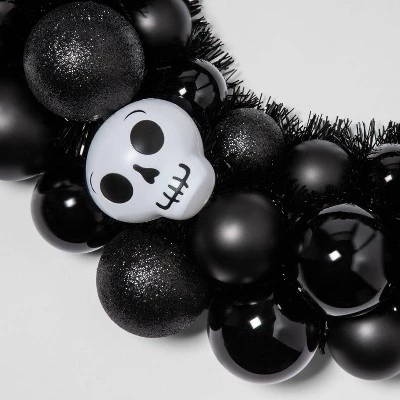The Skull Shatterproof Halloween Wreath from Hyde & EEK! Boutique™ is just the spooky touch your seasonal display has been missing. Designed for indoor and sheltered outdoor use, this plastic wreath features black ornaments, white skulls and black faux pine needles. The attached hanging loop makes it easy to slip onto a nail or hook, and the shatterproof construction is perfect for Halloween parties or families with young kids.