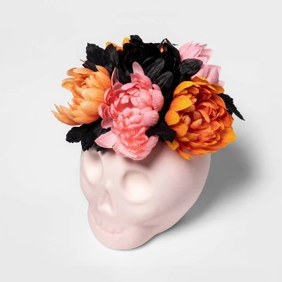 Add soft and spooky floral style to your seasonal decor with the You Put a Spell on Me Skull Mums Halloween Artificial Plant from Hyde & EEK! Boutique™. A subtle skull-style pot holds a faux floral arrangement of pink and orange mums and black leaves. Get one or two of these potted arrangements and display on a shelf, sideboard or tabletop for Halloween decor that goes beyond the norm.