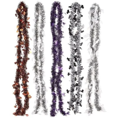 This set of Halloween decor garlands features skull heads, gothic spiders, bats and pumpkin heads. This set of Halloween decoration garlands includes 3 black and white garlands, 1 metallic purple garland and 1 metallic orange garland. Wrap or glue these tinsel garlands so they wrap effortlessly around tables, drawers, door handles and more! Constructed of slim wire material, each of these garland decorations are flexible and easy to bend, helping you apply them with less hassle. Dimensions: Length: 6.4 – 6.6 feet; Diameter of each garland: 9 Inches