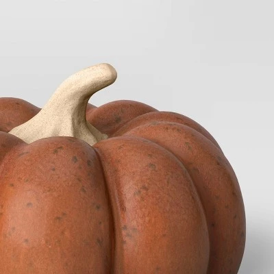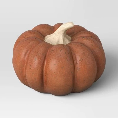 Commemorate fall and the Halloween season by decorating your home with this Large Ceramic Pumpkin from Threshold™. This large decorative pumpkin figurine showcases a sculpted shape in a rust hue with a tiny white stem for a natural look. Place it on your mantel, shelf, sideboard, or arrange it with other fall-inspired figurines and fillers for seasonal flair.