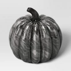 Give a stunning look to your spooky display with this Large Halloween Ceramic Marble Glass Pumpkin in Black from Threshold™. This large marble glass pumpkin figurine makes a beautiful addition to your Halloween decor. It features a black sculpted shape with a brown ribbed stem detail to lend a decorative seasonal-themed look. Just place this piece on your console, mantel or shelf along with other festive accents to complete your cohesive display.