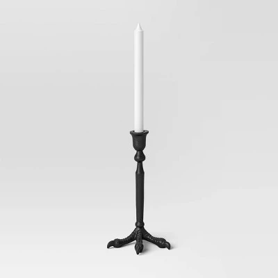Light up your haunted display with this Black Medium Bird Leg Cast Metal Candlestick from Thresholdâ˘. This solid black cast metal candleholder in a lacquered finish makes a great accent for Halloween. It features a spindle shape with a bird talon base for a creepy look. This decorative candleholder easily fits a single taper candle. Set this piece with other Halloween props and accents atop your fireplace mantel, entryway console or sideboard to light up your space.