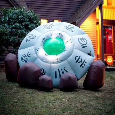Houston we’ve got a problem, an alien spacecraft has tumbled into the front yard. This Crashed UFO Inflatable Prop, which comes with a fan, lights, strings and stakes, can turn your lawn into the landing site for an alien race. It inflates and lights go on when plugged in and the turned on and deflates when turned off. At 6-feet by 10-feet, this saucer shaped ship could probably hold some impressive looking creatures. It’s blue with a green center and black symbols accents. This spacecraft would be considered a close encounter of the second kind, which means that is there is physical evidence of an alien presence. If you want to build on your extraterrestrial theme, order the ship along with one of our alien inflatables; you will then have a close encounter of the third kind, an encounter with a creature.
