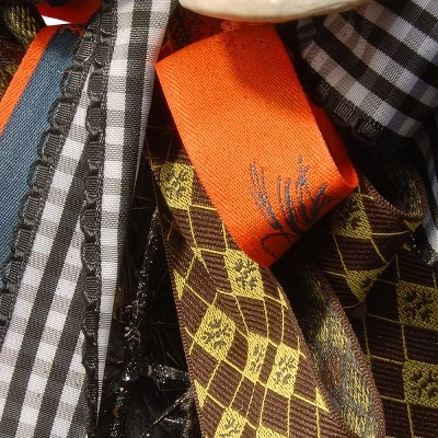 This Halloween decoration features a top hat wearing skull dressed with patterned necktie ribbons. Bone arms and hands embrace s tangle of black branches trimmed with black leaves and orange berries. Hang this ghoulish wreath on doors, walls and windows in indoor or covered outdoor locations.