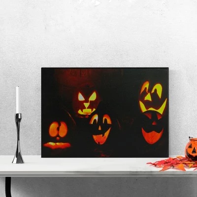 This mix of goofy and scary jack-o-lanterns adds the perfect festive touch to your Halloween decorPre-lit with 6 LED amber colored lightsThe eyes light up in 3 of the pumpkinsTimer – 6 hours on / 18 hours offOn off switch on the sideRequires 2 AA batteries – not includedDimensions: 12″H x 15.75″W x .5″LMaterial(s): canvas/plastic/metalNote:Item does not come with a battery cover – open design holds the batteries snugly