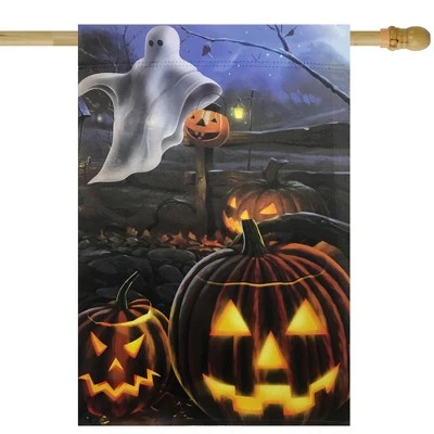 Happy Halloween! Display your love of the Halloween season with this spooky Halloween flag! Showing the classic symbols of the season, this flag is the perfect addition to your Halloween decor. Hang this on your house and everyone will know where the fun festivities are!Features:Halloween garden flagScary jack-o-lanterns and a floating ghostDark orange, purple and black hues throughout the flagFeatures a soft, high-quality fabric for durabilitySleeve on top allows the flag to slide onto the flagpoleDesign is on both sidesCare instructions: Hand wash in cold water with mild soap. Hang dry. Use cool iron if neededDimensions: 40″ long x 28″ wideMaterial(s): polyesterNote: Flagpole is not included