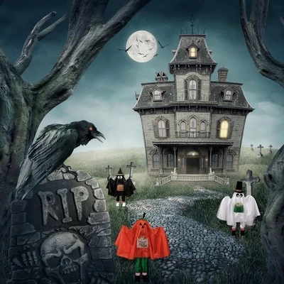 Nothing says Halloween like ghost, bats, and jack-o-lanterns. Each figure comes posed with hands in a scaring position, and features a straw filled pocket on the front with the words “Trick or Treat”. The weighted feet keep the figures standing in place. Perfect for welcoming Trick-or-Treaters to your home. Product Features:Halloween kids outdoor yard decorFeatures a pumpkin, ghost and batEach kid wears a trick or tree signWeighted feetLight assembly is requiredPerfect for indoor and outdoor useDimensions: Ghost: 34″H X 33″ x 5″DPumpkin: 36″H x 33″W x 5″DBat: 36″H x 33″W x 5″DMaterial(s): plastic/fabric