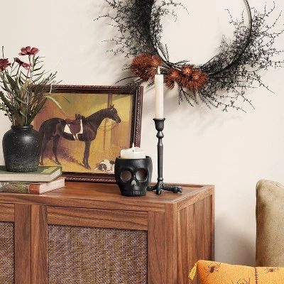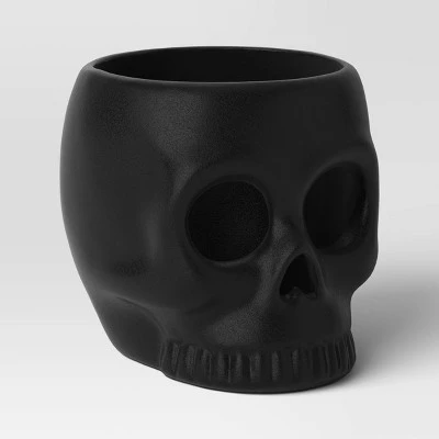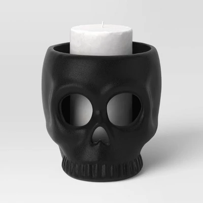 Add a creepy glow to your haunted house or graveyard scene with this Small Reactive Glaze Black Ceramic Stoneware Skull Candleholder from Threshold™. This small skull-shaped candleholder detailed with cutout eyes and a nose makes a great tabletop accent for Halloween. Made from ceramic in a solid black smooth finish, it goes well with any of your spooky settings. This decorative candleholder easily fits a single pillar candle. Set this piece with other Halloween props and accents atop your fireplace mantel, entryway console or sideboard to light up your space.