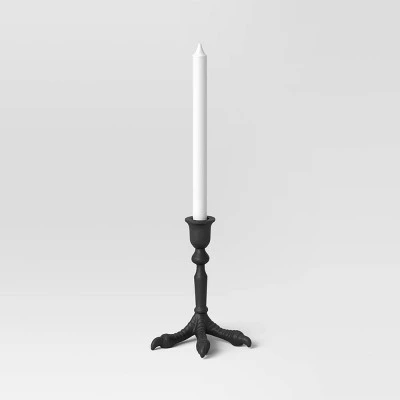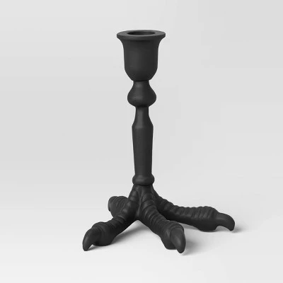 Add a frightening look to your table with this Black Small Bird-Leg Cast Metal Candlestick from Threshold™. This solid black cast metal candleholder in a lacquered finish makes a great accent for Halloween. It features a spindle shape with a bird talon base for a creepy look. This decorative candleholder easily fits a single taper candle. Set this piece with other Halloween props and accents atop your fireplace mantel, entryway console or sideboard to light up your space.