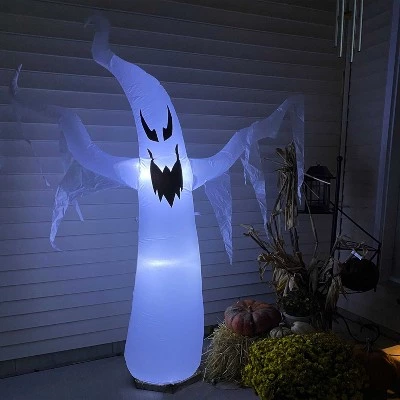 Bring gleeful fright and spooky cheer to the front yard this Halloween with this ghost inflatable decoration. The blow-up yard decor features classic style with creepy arms as well as a mean, scary face! This 7-foot-tall Halloween inflatable is sure to spread spookiness throughout the neighborhood with his tall stature and long, spooky, flowing arms. Featuring 190T thick polyurethane-coated polyester material to easily withstand the outdoor elements, this inflatable is designed for durability. Included with the ghost are ropes and stakes to keep in place, a UL adaptor plugin, LED lights, as well as a fan for inflation, so you can easily set up, take down, and store this inflatable with ease. The included LED lights in the body of this ghost will ensure that the inflatable can be seen spreading Halloween frights all night long. Place this spooky ghost decoration in your kitchen, living room, or yard, and get into the Halloween spirit!