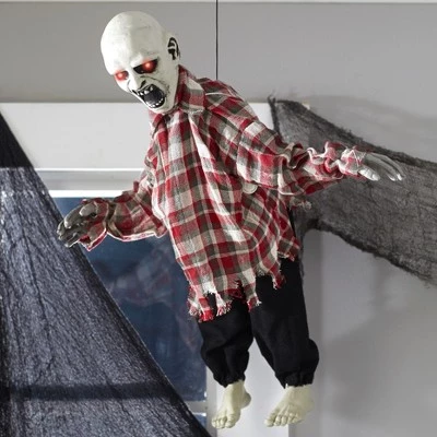 Add a unique and fun design element to your outdoor Halloween display with this animatronic zombie decoration. It is designed with a motion-activated trigger. When someone walks by it, it has red lighting that turns on and flashes. To make the effect that more unique, the limbs shake and vibrate as if wanted to give chase. There are no cords or wire that you have to plug in or worry about length with. Polyester, plastic, metal and foam. Requires 3 “AA” batteries. Comes ready to hang by an invisible string. 27-1/2″W x 4″D x 29″H