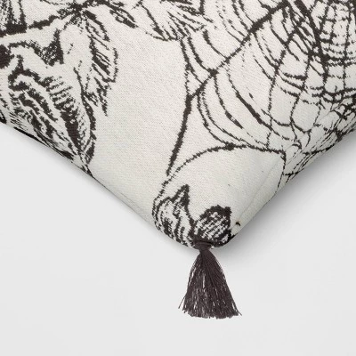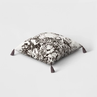 Add some Halloween flair to your bedding or seating ensemble with this Woven Floral Square Throw Pillow from Thresholdâ˘. Made of a soft cotton blend with comfortable filling, the square jacquard throw pillow showcases a black floral pattern and a spiderweb motif on an off-white backdrop, along with matching tasseled corners for a playful look. Style it solo on a chair or incorporate it into a group of pillows with other autumnal hues and patterns on a sofa or loveseat.